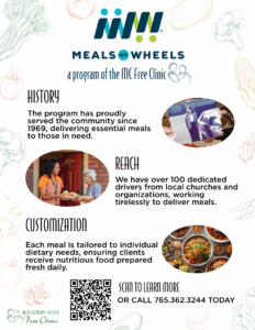 Call the Montgomery County Free Clinic at 765.362.3244 to sign up, or complete this meal-delivery interest form.